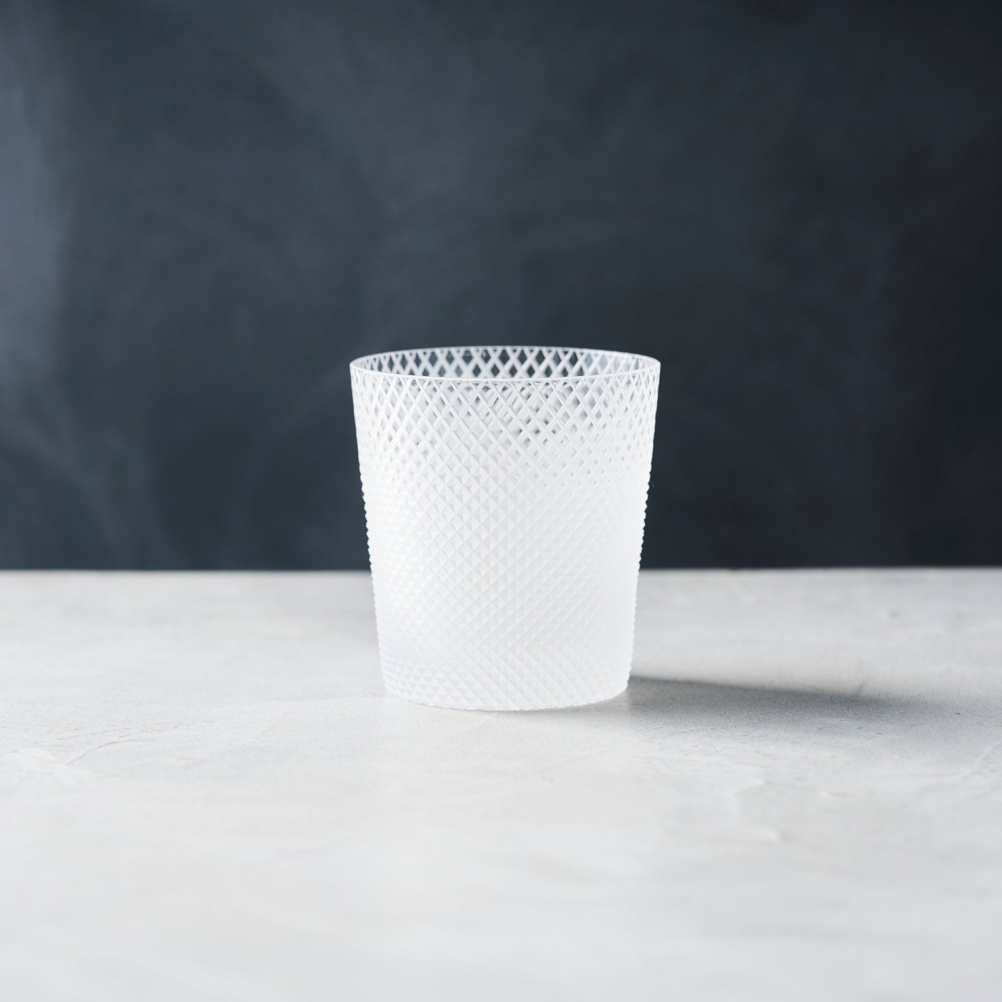 グラスの下部に施されているカットは、江戸切子の代表的文様「魚子(ななこ)」と呼ばれるもの。この魚子部分が、グラスの口元に向かうにつれて文様が広がるように変化していきます。カットの交差を隙間なく施した文様が魚子であり、交差するカットの間に小さな隙間を持たせることで、別の代表的文様「矢来」文様と移りゆくデザインとなりました。
